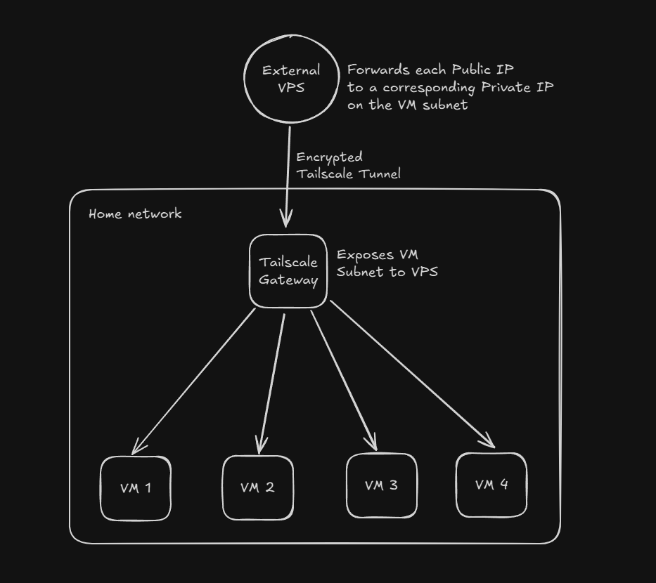 To get around this I run a vps with multiple public ips which has a secure encrypted tunnel back into a tailscale gateway running inside my home network which exposes the vm subnets/network, this setup also means I don’t have to install tailscale on any vms.
